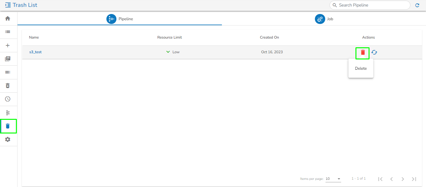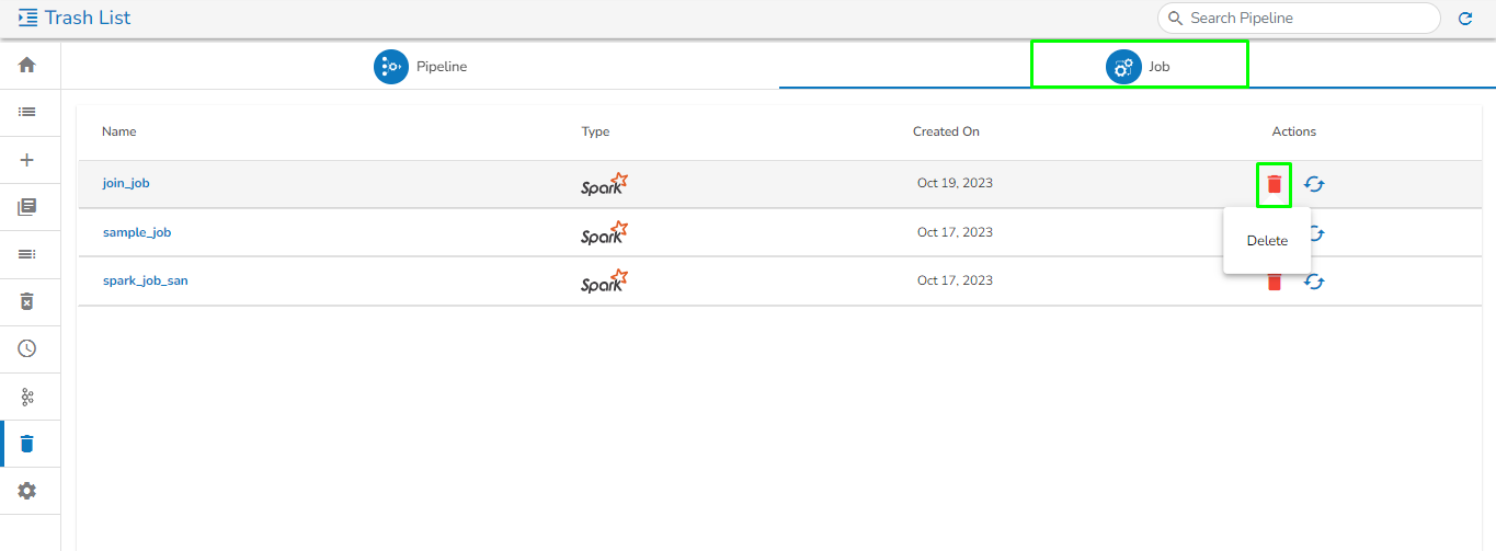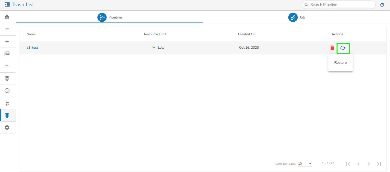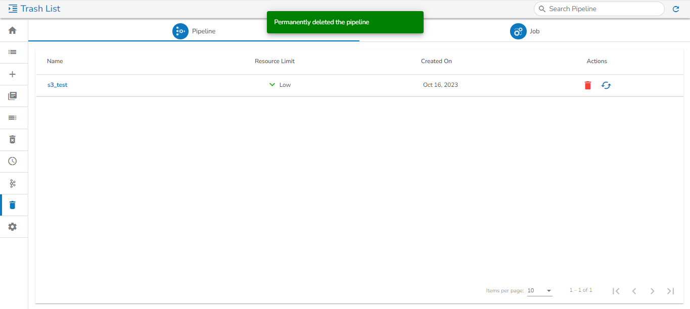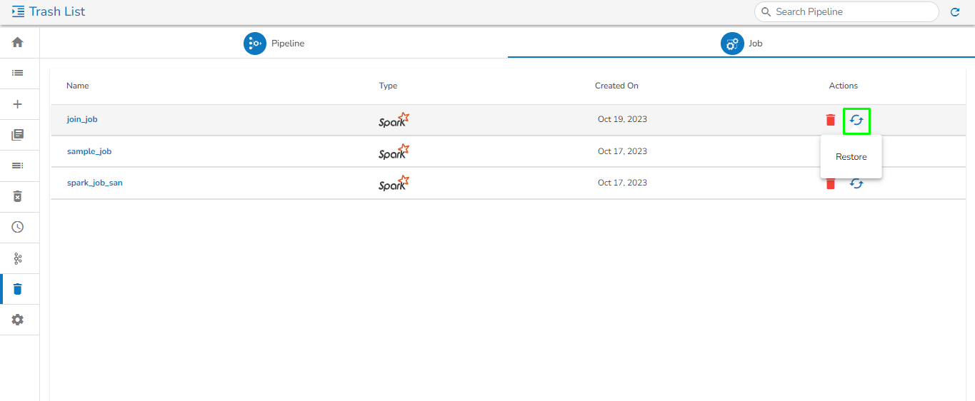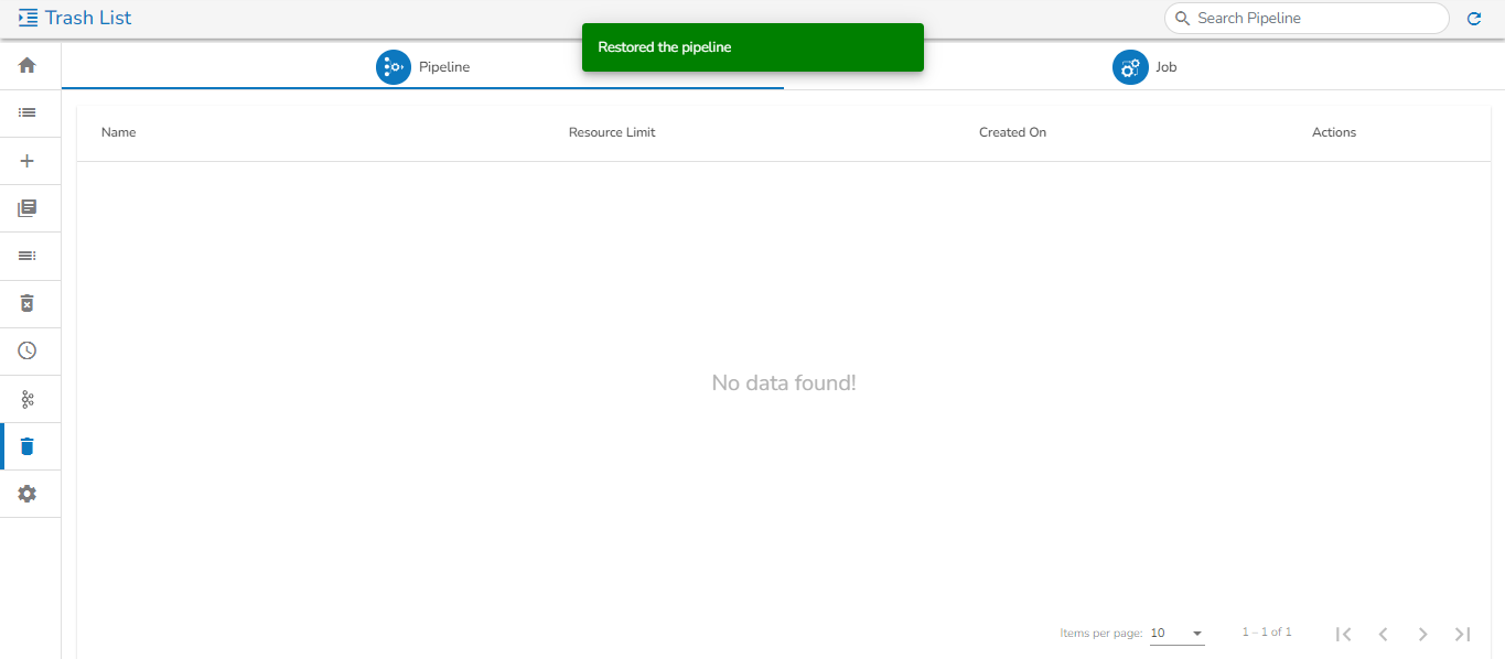 *<mark style="color:green;">Please Note:</mark> The **Trash** page at present displays only those pipelines which are deleted by the logged in user from the **Pipeline/Job Editor** page by a user.*&#x20;