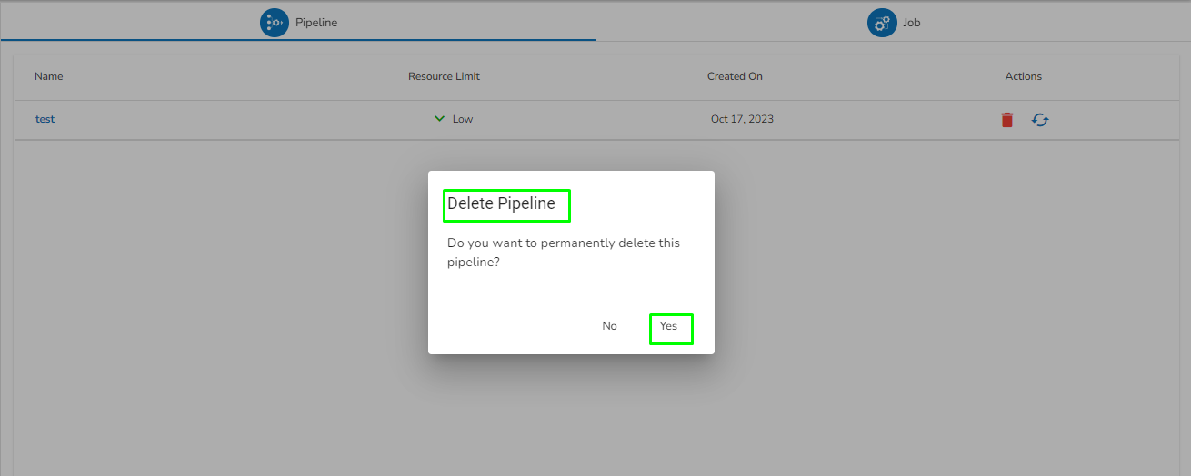 * The ***Delete Pipeline/Job*** dialog box opens.