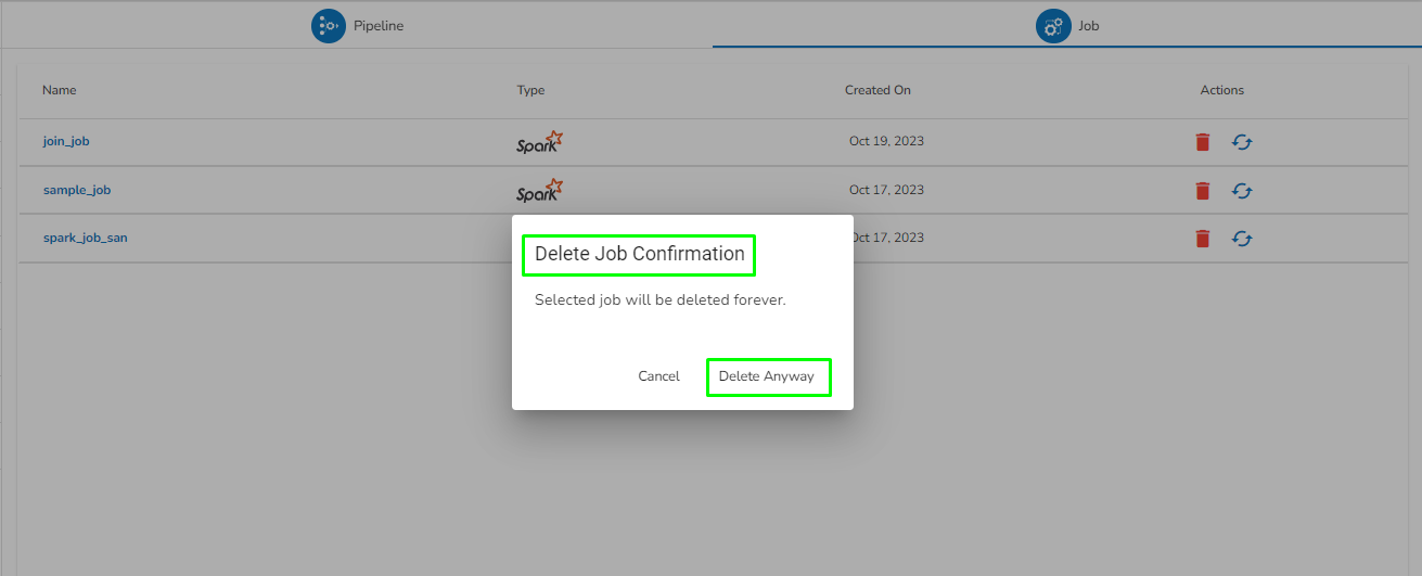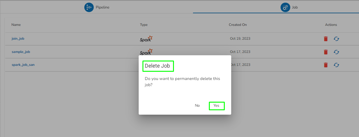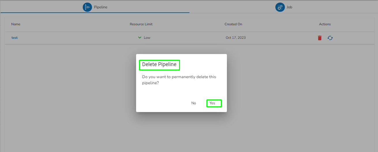 * A notification message appears and the Pipeline/Job Permanently gets deleted for the user.