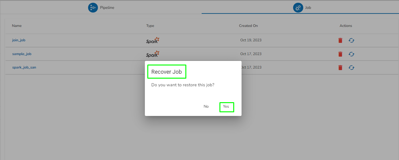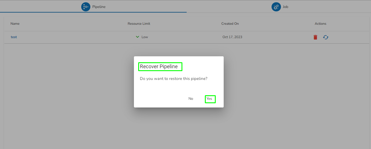 * A notification message appears that the ***Pipeline/Job*** has been restored.   &#x20;