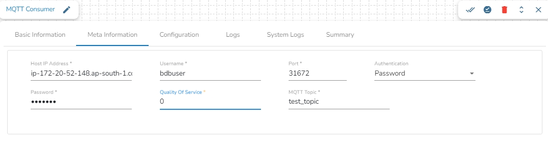 MQTT topic: Enter the name of the MQTT topic from where the messages have been published and to which the messages have to be consumed.