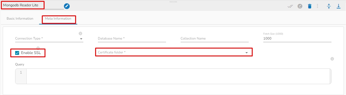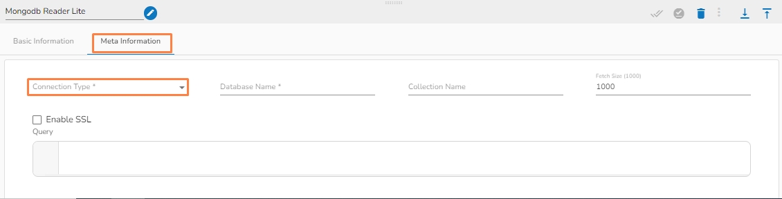Open the Meta Information tab and fill in all the connection-specific details of MongoDB Reader Lite. The Meta Information tab opens with the below given fields: