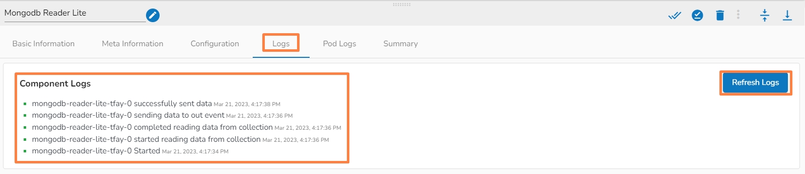A configured component will display some more tabs such as the Configuration, Logs, and Pod Logs tabs (as displayed below for the Mongodb Reader Lite component).