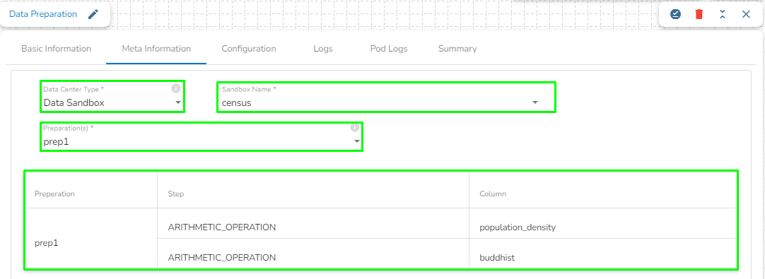 ***Data Preparation component as a pert of Pipeline Workflow (Selected Data Center Type is Data Sandbox)***