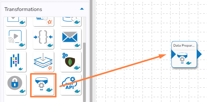 * Select the Data Preparation from the Transformations group and drag it to the Pipeline Editor Workspace.