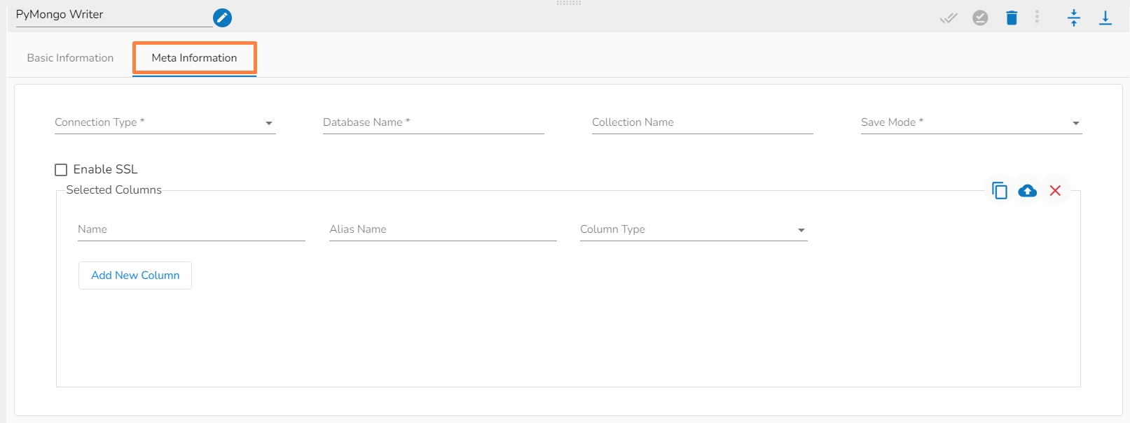 Open the Meta Information tab and configure all the connection-specific details for the PyMongo Writer.