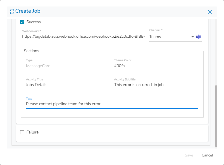 <figure><img src="https://content.gitbook.com/content/6ZP8JhQPMmuTgMyLMcCU/blobs/1F1s4Dn9qfGA7v7Dtm98/image.png" alt=""><figcaption><p>Configuring Job Alert as 'Teams' as a channel</p></figcaption></figure>