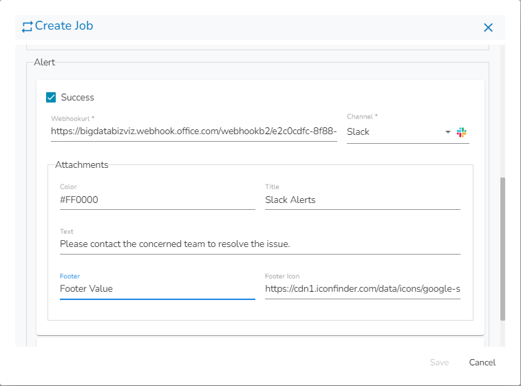 * **Footer Icon:** In Slack, the footer icon refers to an icon or image that is displayed at the bottom of a message or attachment. The footer icon can be a company logo, an application icon, or any other image that represents the entity responsible for the message. **Enter image URL as the value of Footer icon.**