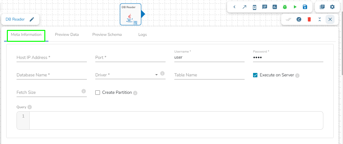 Drag the DB reader task to the Workspace and click on it to open the related configuration tabs for the same. The Meta Information tab opens by default.