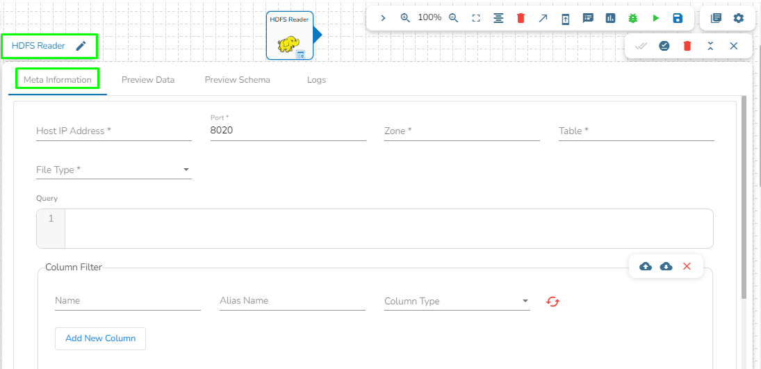Drag the HDFS reader task to the Workspace and click on it to open the related configuration tabs for the same. The Meta Information tab opens by default.