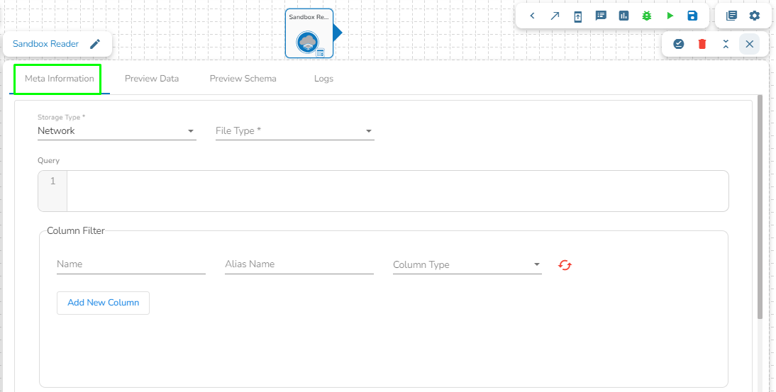 Drag the Sandbox reader task to the Workspace and click on it to open the related configuration tabs for the same. The ***Meta Information*** tab opens by default.