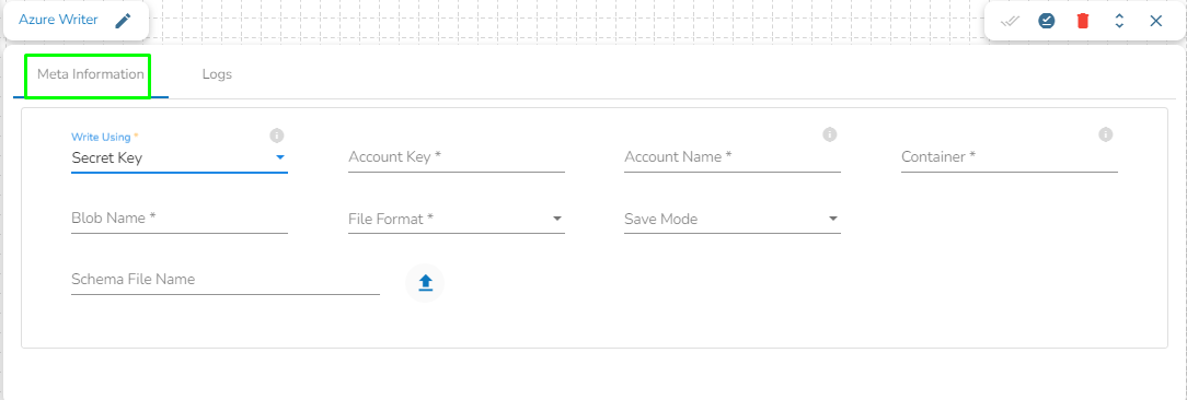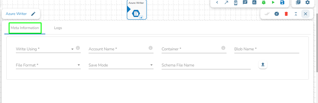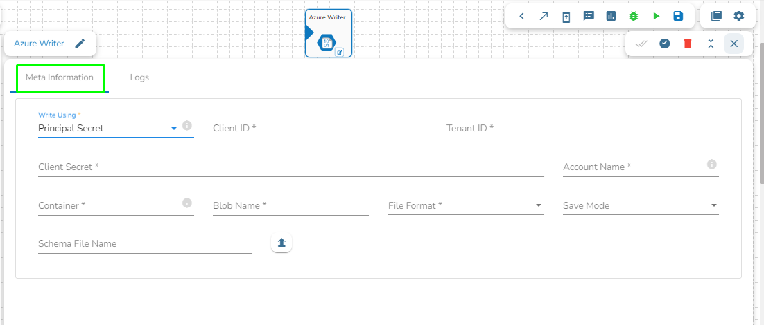 Drag the Azure writer task to the Workspace and click on it to open the related configuration tabs for the same. The Meta Information tab opens by default.