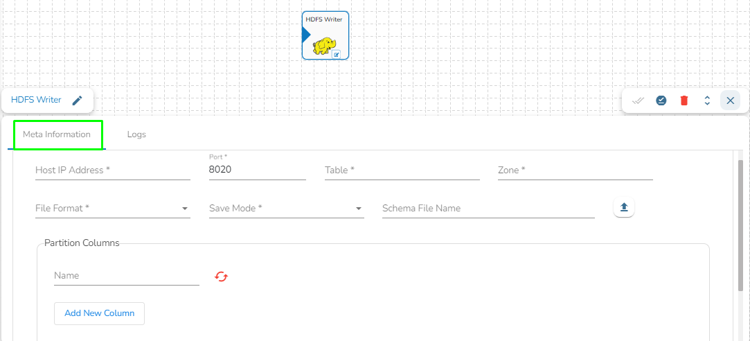 Drag the HDFS writer task to the Workspace and click on it to open the related configuration tabs for the same. The ***Meta Information*** tab opens by default.