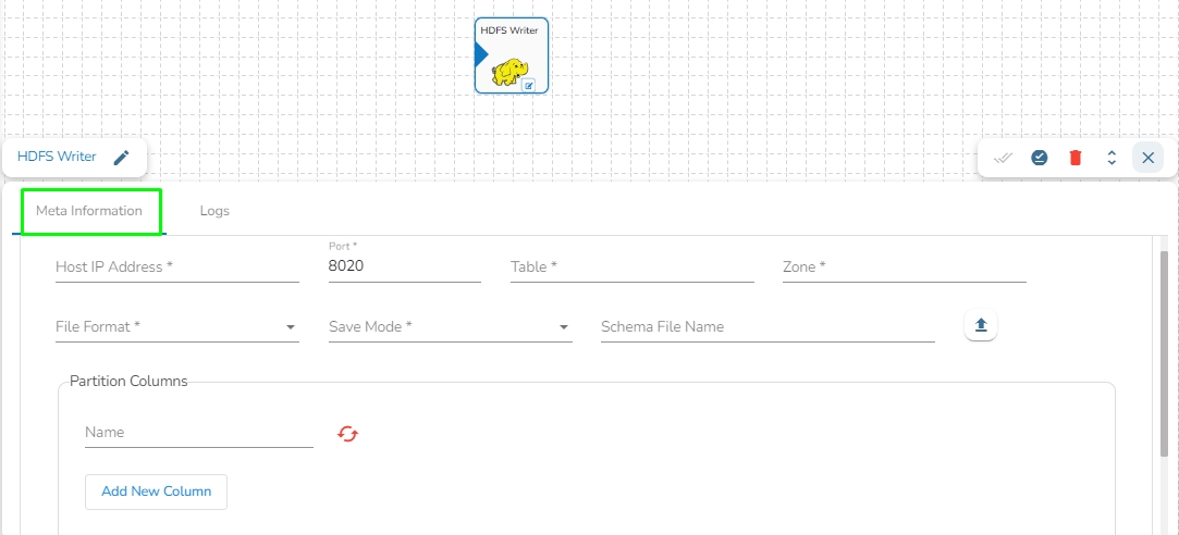 Drag the HDFS writer task to the Workspace and click on it to open the related configuration tabs for the same. The Meta Information tab opens by default.