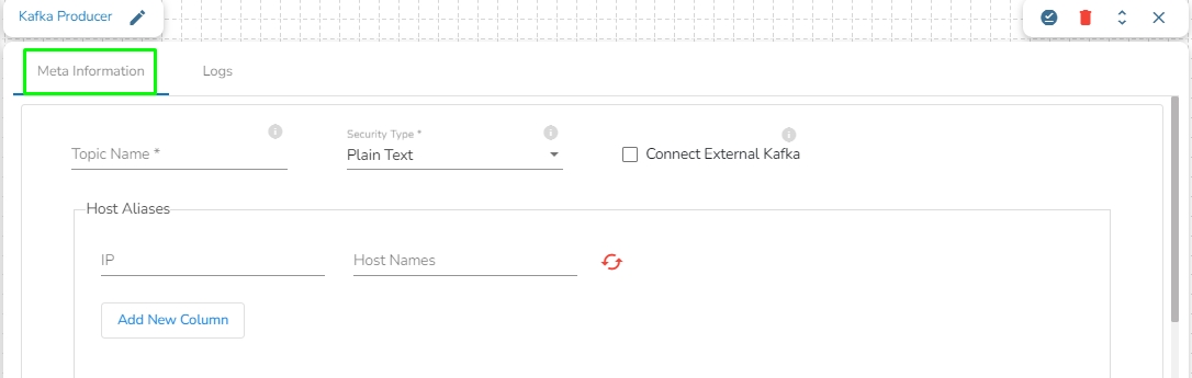 Drag the Kafka Producer task to the Workspace and click on it to open the related configuration tabs for the same. The Meta Information tab opens by default.
