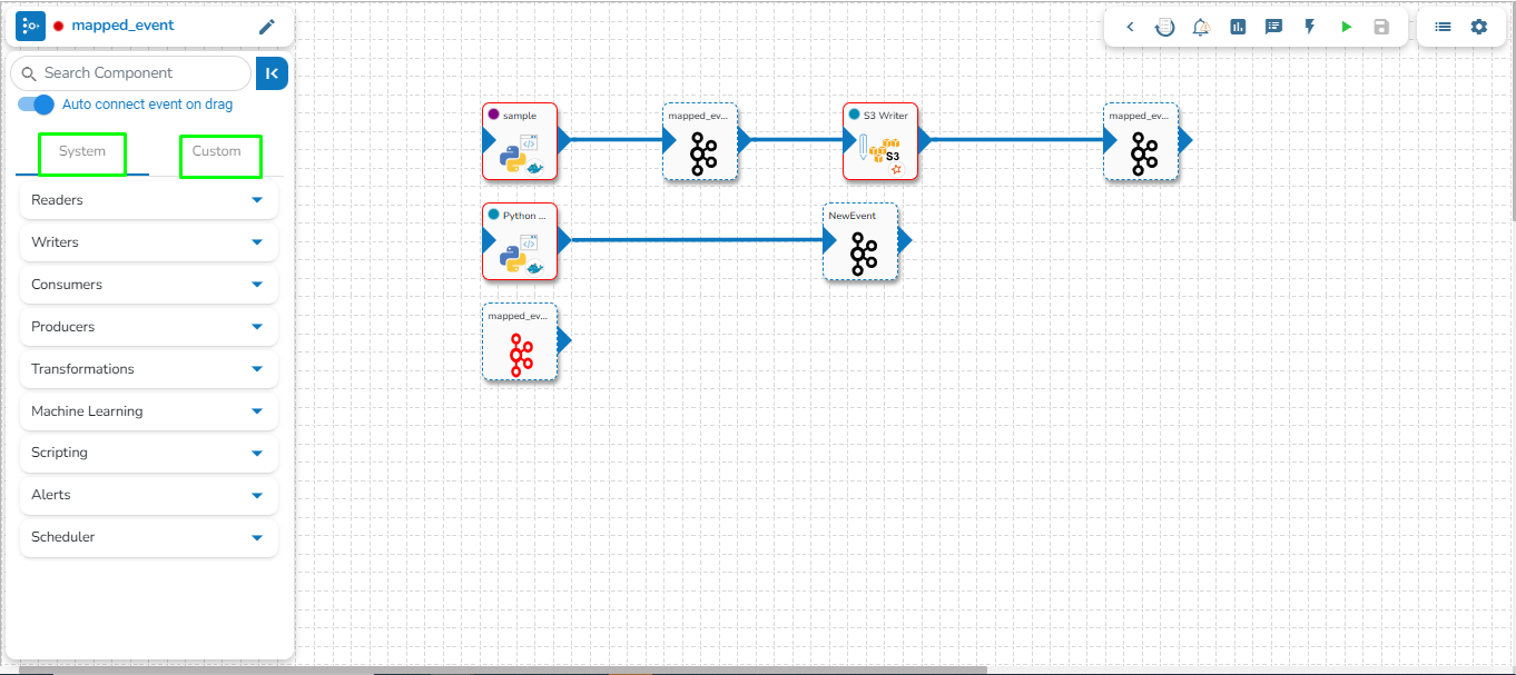 Once dragged and dropped to the pipeline workspace, components can be directly connected to the nearest Kafka Event. To enable the auto-connect feature, the user needs to ensure that the Auto connect event on drag option is enabled, which is the default setting.