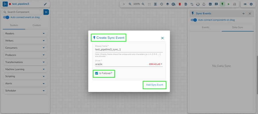 Failover Data Sync The failover Data Sync Event gets configured, now the user can map it with any component in the pipeline workflow.