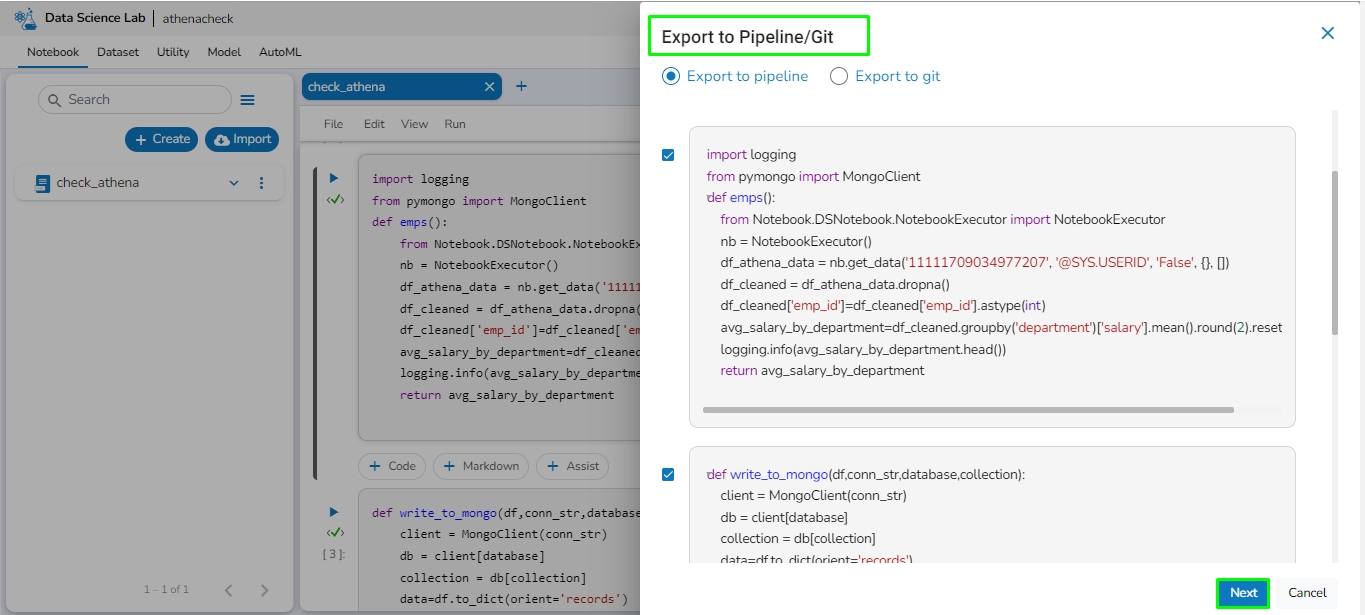 This feature enables users to export their written scripts from DS Lab notebook in order to use them in Pipeline and Jobs