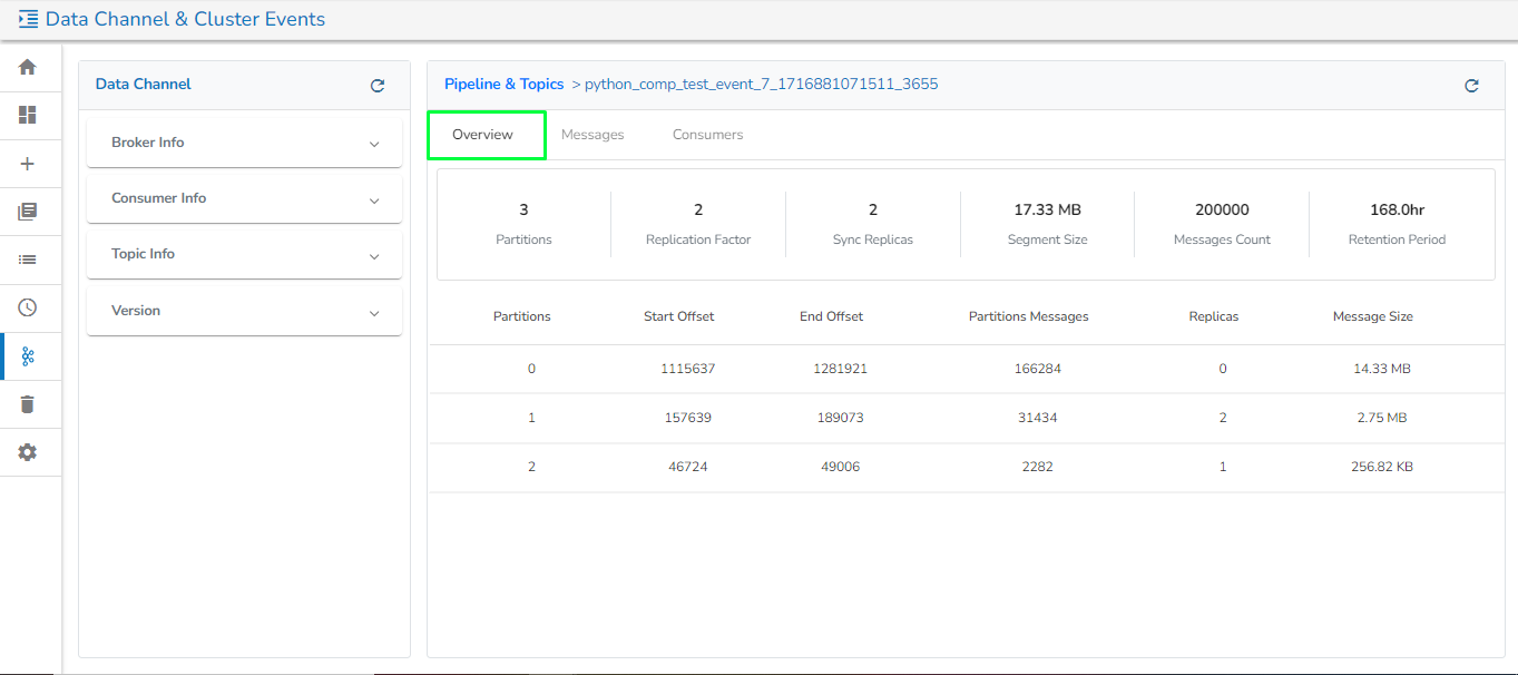 Additionally, this tab lists all the partition details along with their start and end offset, the number of messages in each partition, the number of replicas for each partition, and the size of the messages held by each partition.
