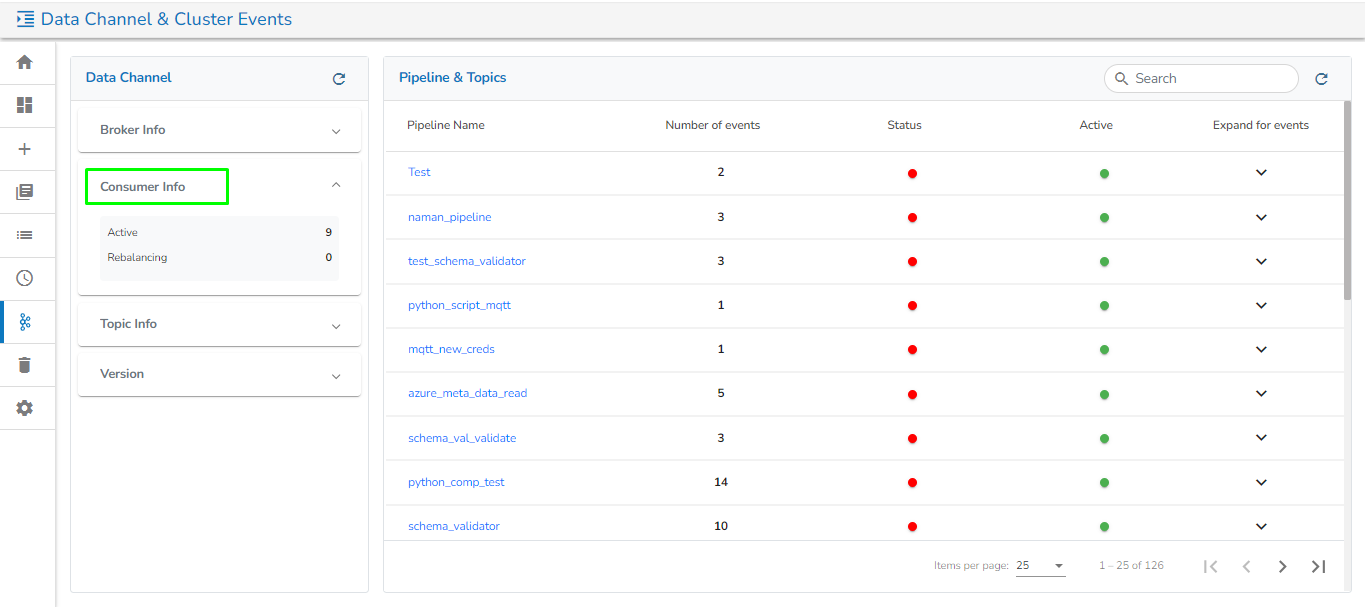 The ***Data Channel & Cluster Events*** page presents a comprehensive list of all Broker Info, Consumer Info, Topic Info, Kafka Version, and all the events used in the pipeline. It allows users to flush/delete the events.