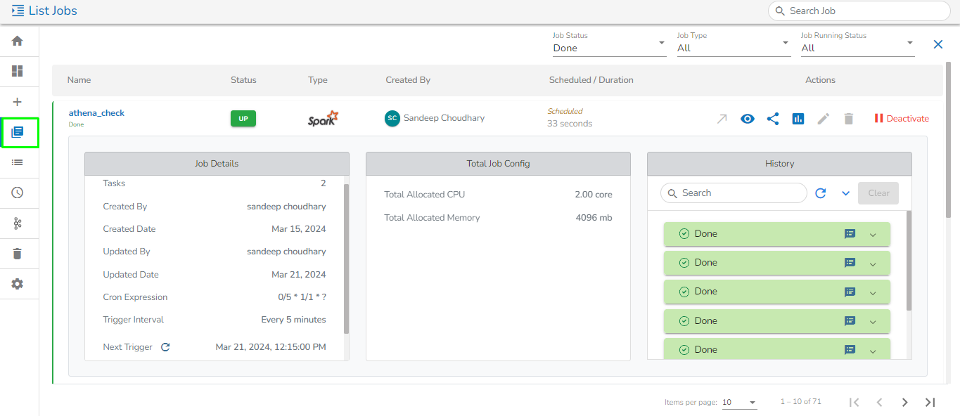 <figure><img src="https://2386645923-files.gitbook.io/~/files/v0/b/gitbook-x-prod.appspot.com/o/spaces%2F6ZP8JhQPMmuTgMyLMcCU%2Fuploads%2Fu8fUi2FdvTKqH5Kc1iSH%2Fimage.png?alt=media&#x26;token=7f2c04bb-8e2f-4386-ba66-1ced9bad5246" alt=""><figcaption><p><em><strong>Displaying Job Details, Total Job Config &#x26; Job History for Spark Job</strong></em></p></figcaption></figure>