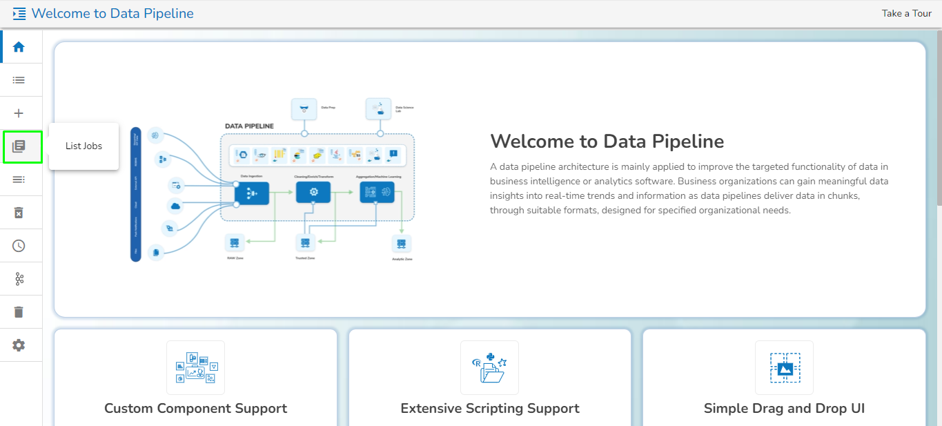 <figure><img src="https://content.gitbook.com/content/6ZP8JhQPMmuTgMyLMcCU/blobs/6QwzLeTb3SLujWYvrRsH/image.png" alt=""><figcaption><p><em><strong>Accessing the List Job option from Pipeline Homepage</strong></em></p></figcaption></figure>