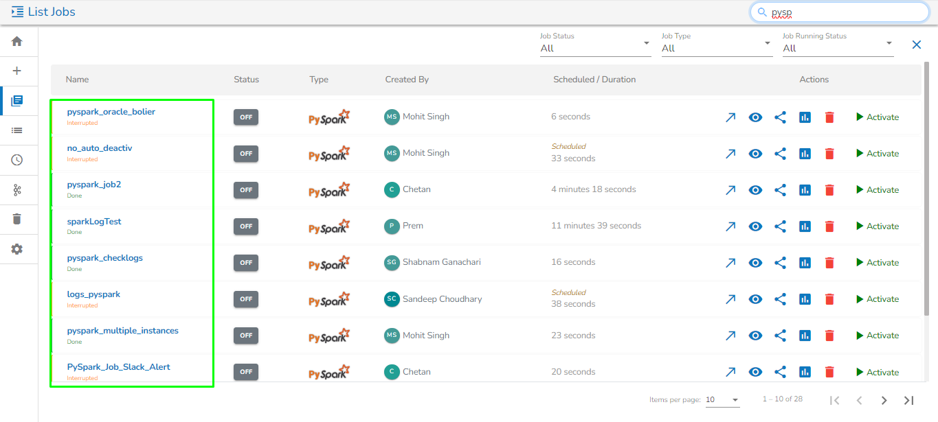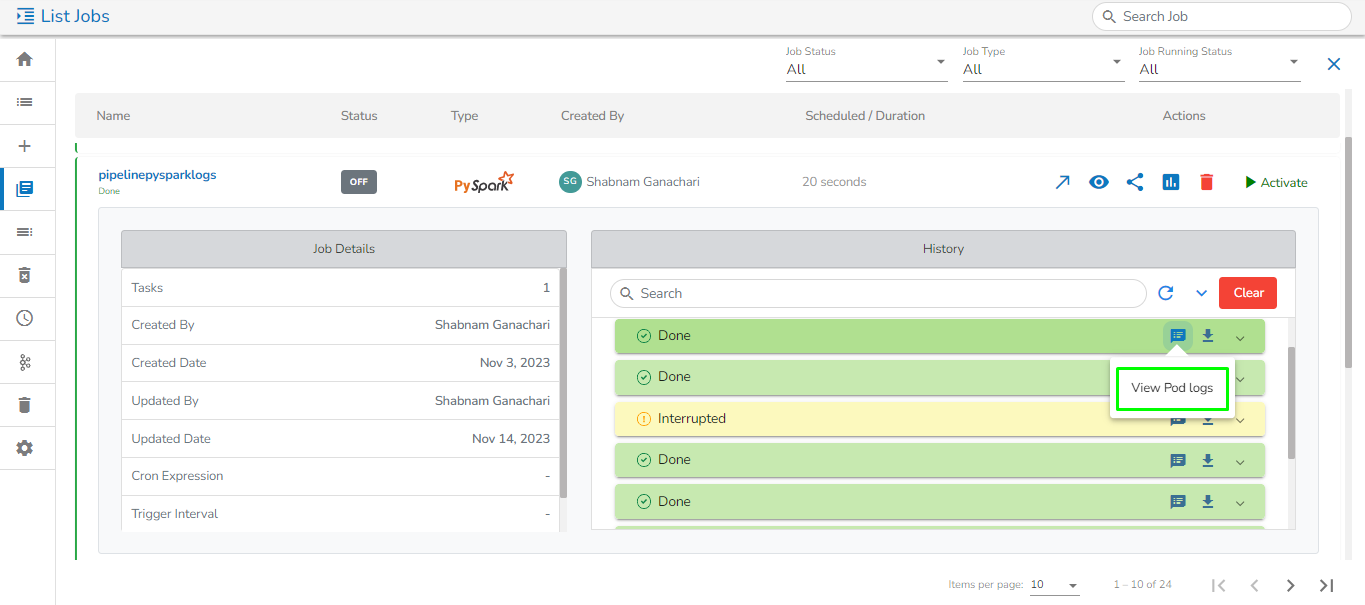 <figure><img src="https://content.gitbook.com/content/6ZP8JhQPMmuTgMyLMcCU/blobs/eL4PqMn8qFSgHp8xezfU/image.png" alt=""><figcaption><p><em><strong>View and Download Pod logs option for PySpark Job from List Jobs page</strong></em> </p></figcaption></figure>