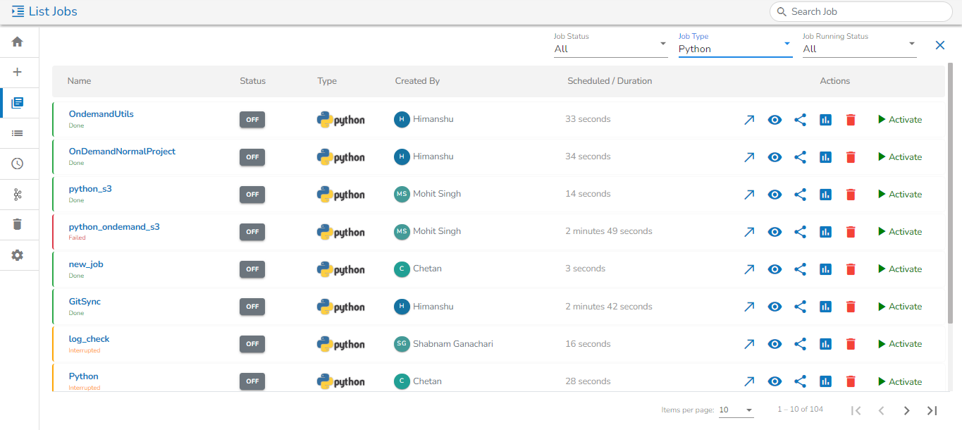 The user can also customize the ***Job List*** by choosing available filters such as ***Job Status***, ***Job Type***, ***Job Running Status***:
