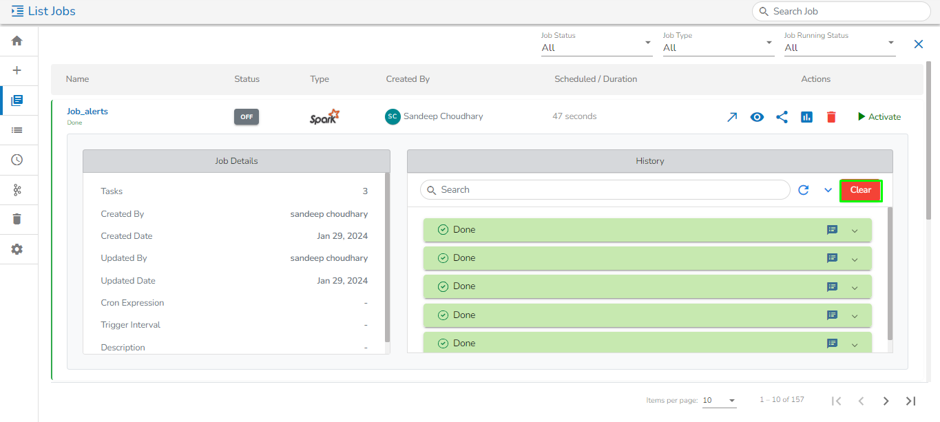 * **Clear**: It will clear all the job run history from the ***History*** tab. Please refer the below given image for reference.