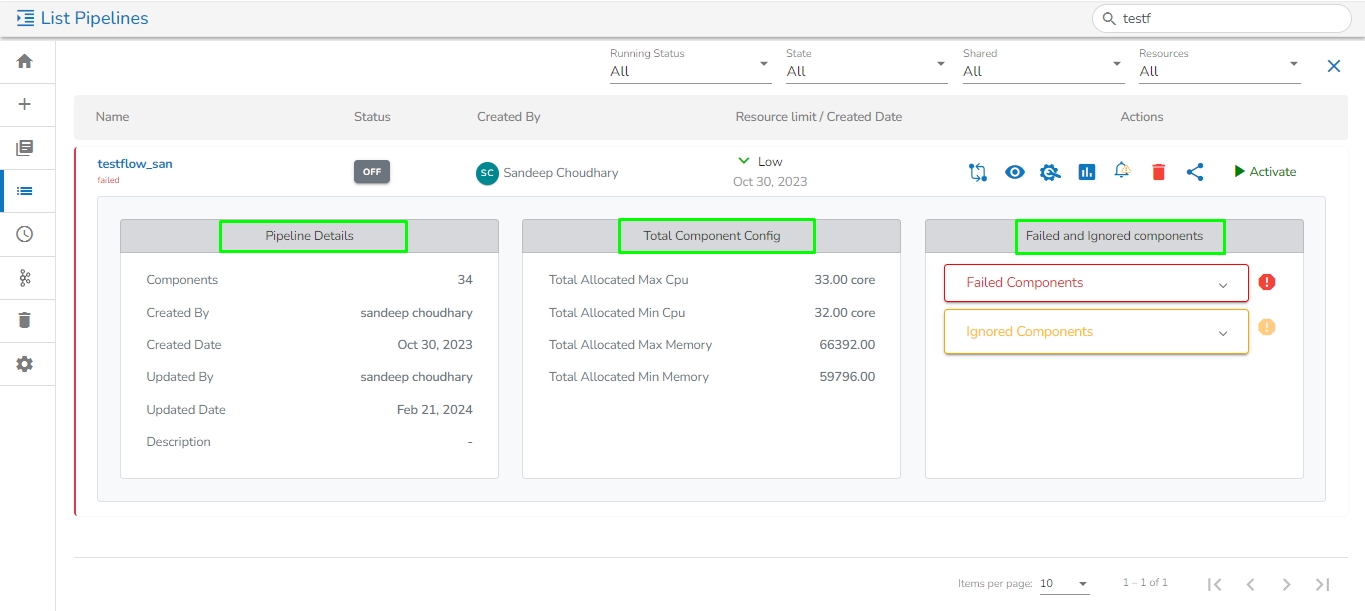 The user can activate/deactivate the pipeline by clicking on the Activate/ Deactivate icon.