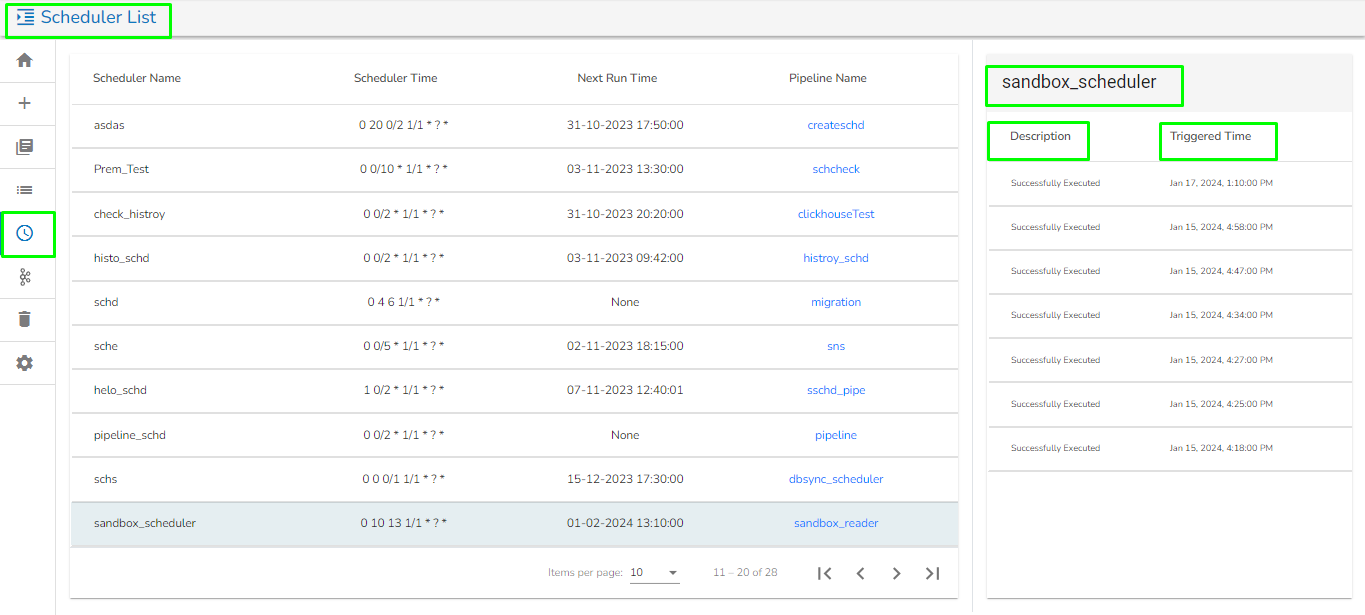 * **Pipeline Name:** The name of the pipeline where the scheduler is configured and used. Clicking on this option will directly redirect the user to the selected pipeline.