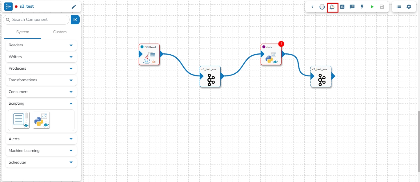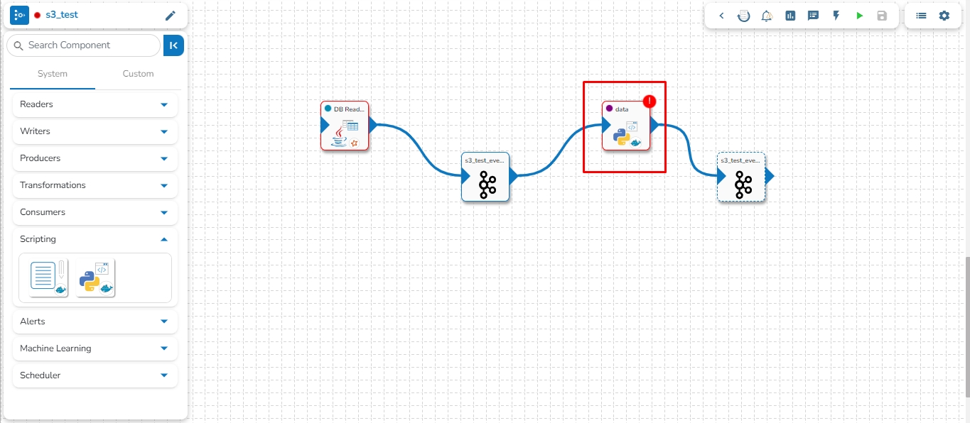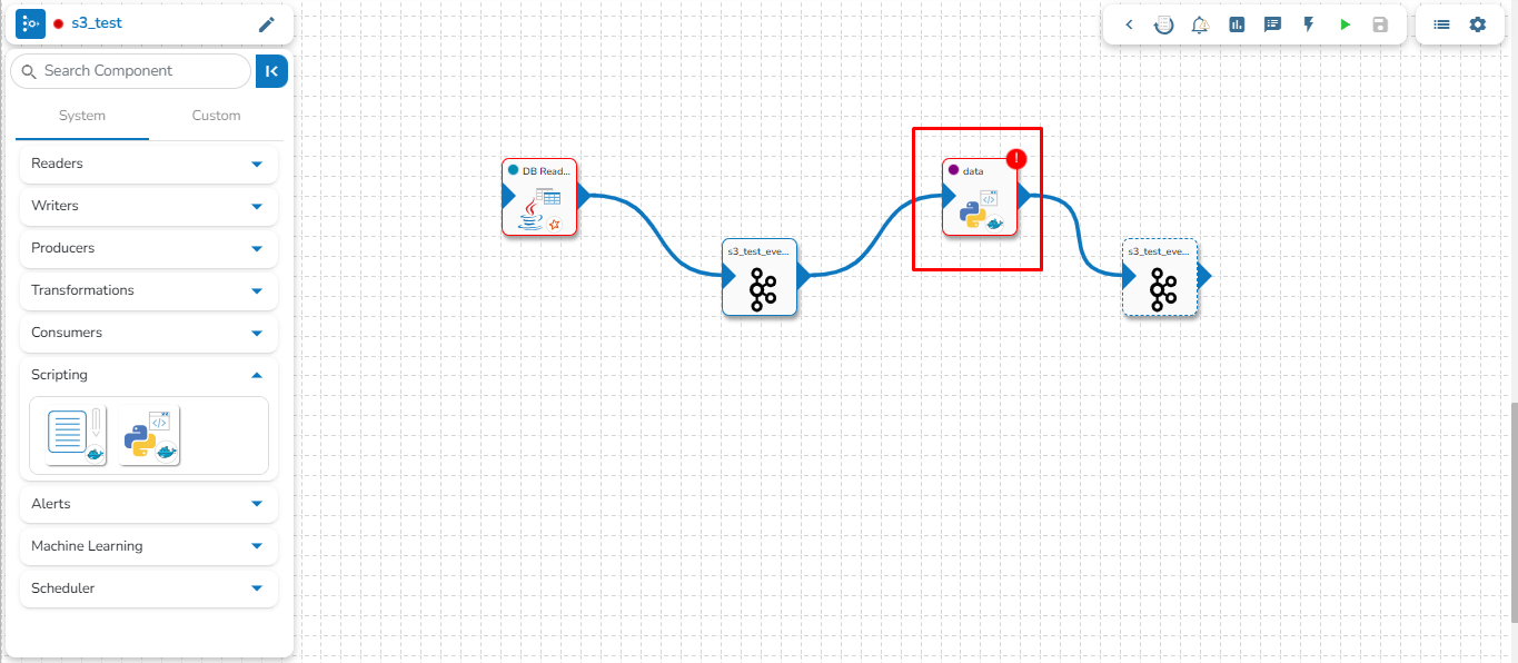 If any component fails while running the Pipeline workflow, a red color flag pops-up on the top right side of the component.