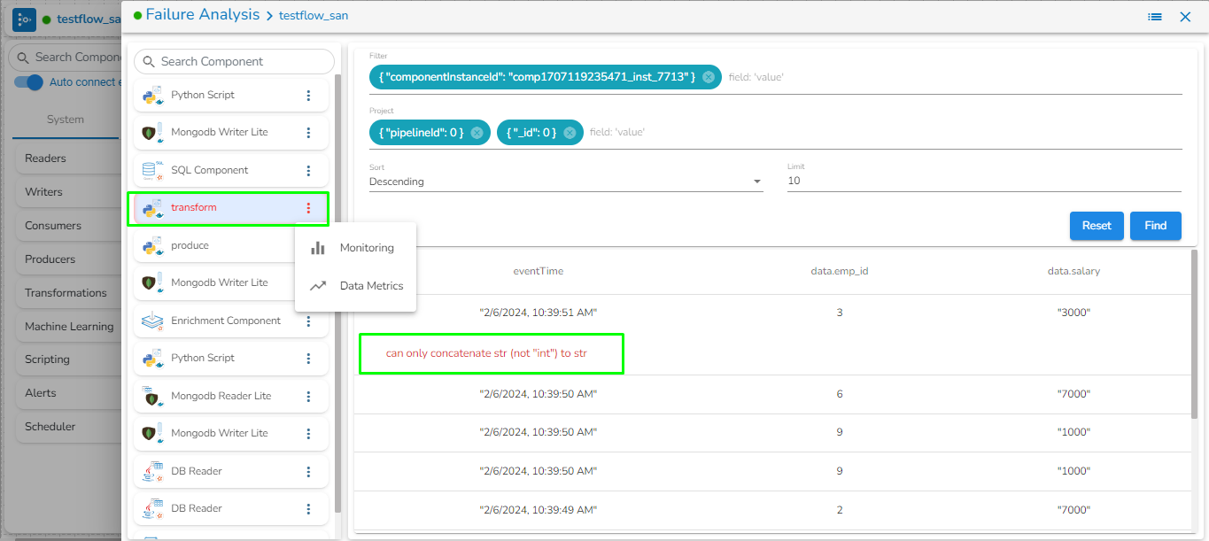 By clicking the ellipsis icon for the failed component from the Failure Analysis page, the user gets options to open Monitoring or Data Metrics page for the component.