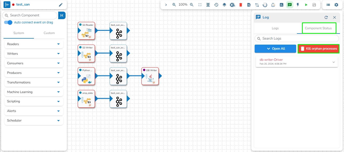 The user can access the Kill Orphan Processes option under the Component Status tab of the Log Panel.