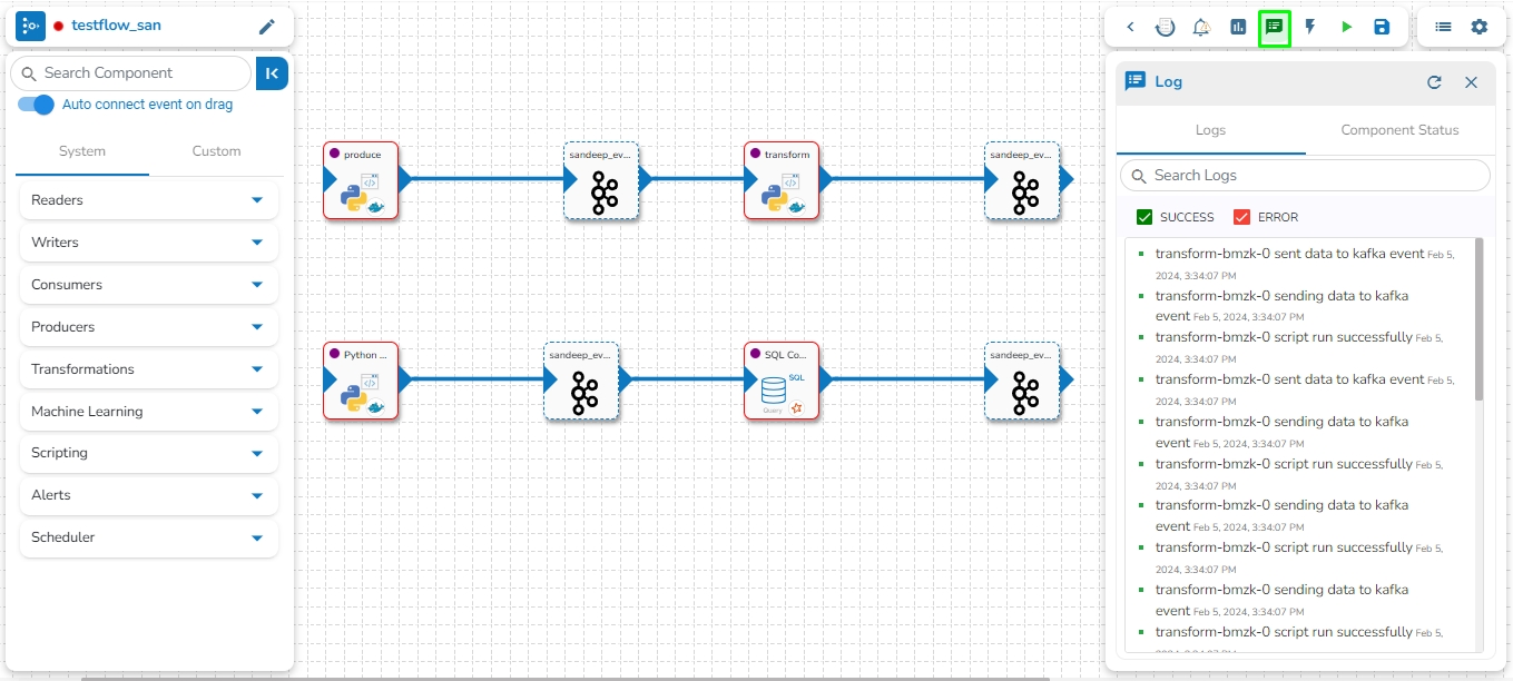 Select the Component Status tab from the Log panel to display the status of the component containers. By selecting the Open All option, it will list all the components.