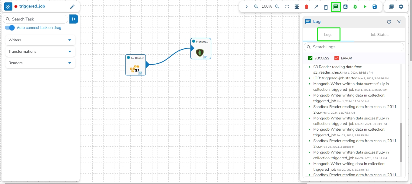 A Log panel toggles displaying the collective component logs of the pipeline/Job under the Logs tab.