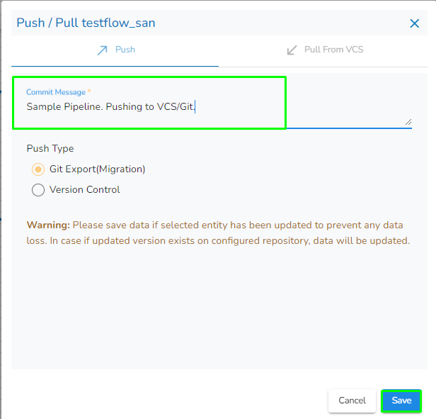 2.GIT Export (Migration): This is for pipeline migration. The pushed pipeline can be migrated to the destination environment from the migration window in Admin Module.