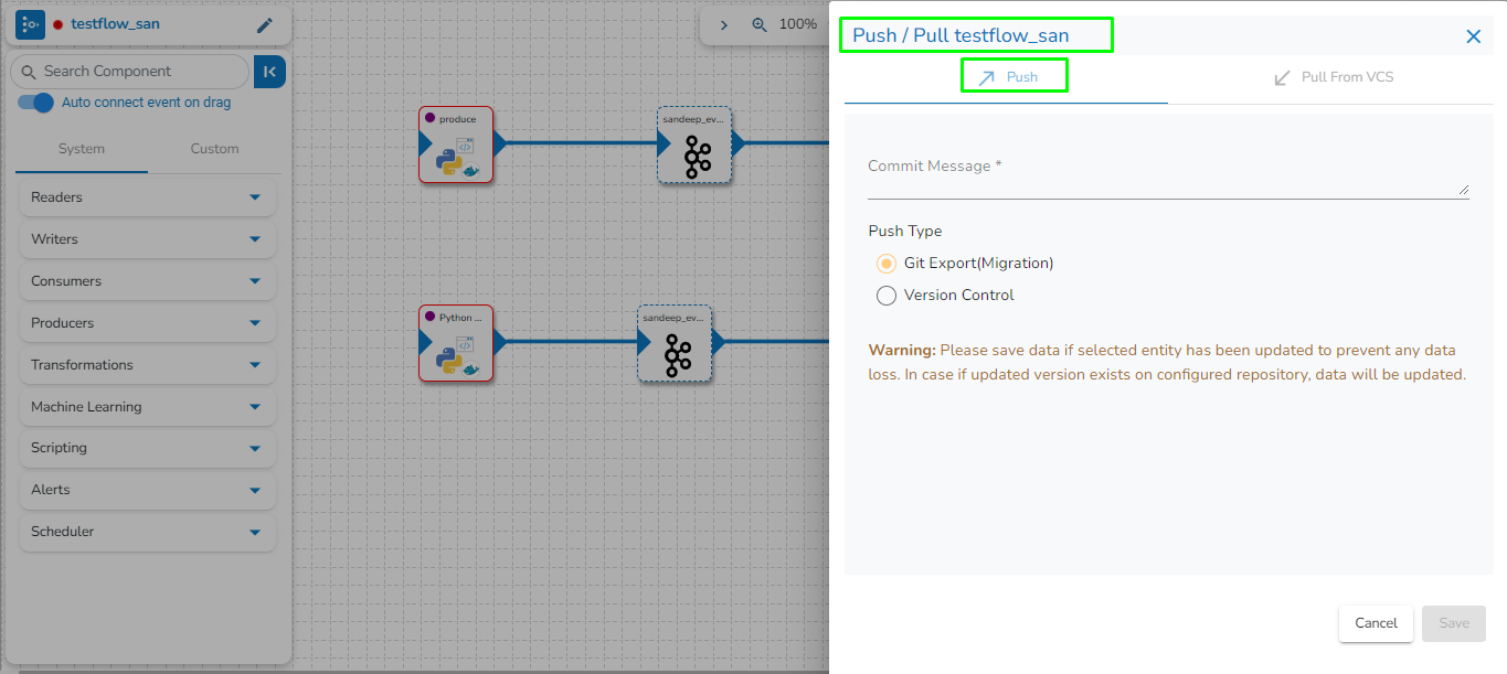 icon.The user also gets an option to Push the pipeline to GIT. This action will be considered as Pipeline Migration.