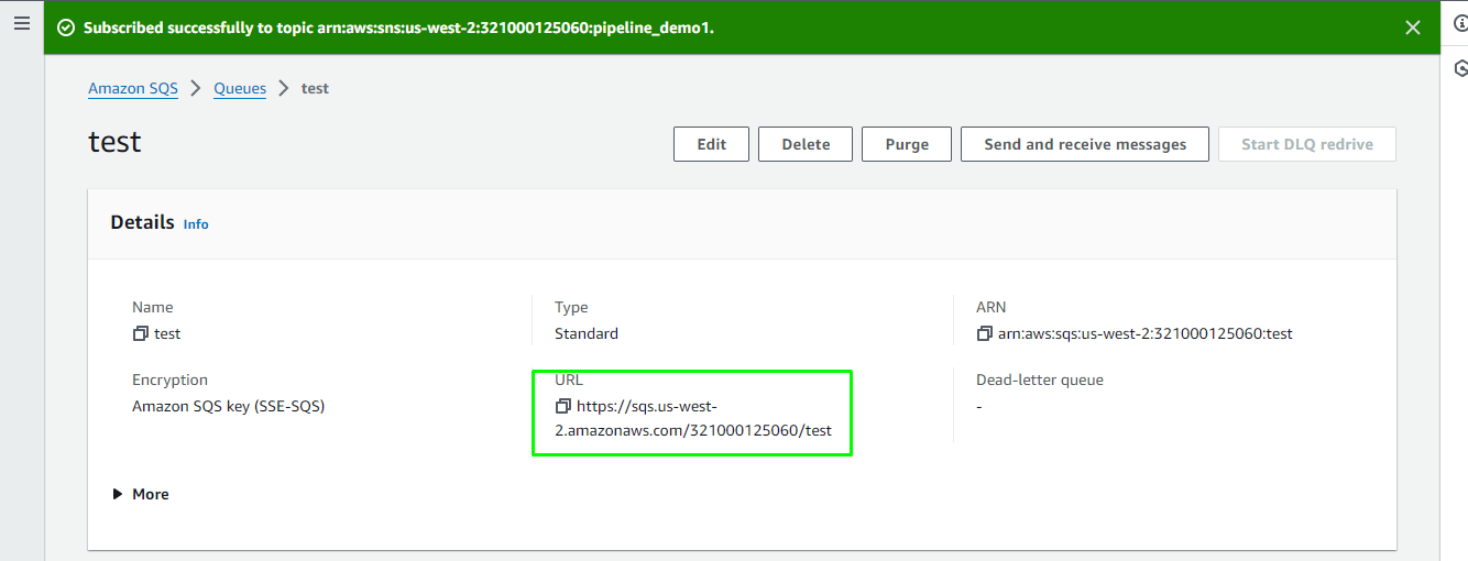 Once the subscription is created successfully, the SQS URL will be displayed in the subscription details.