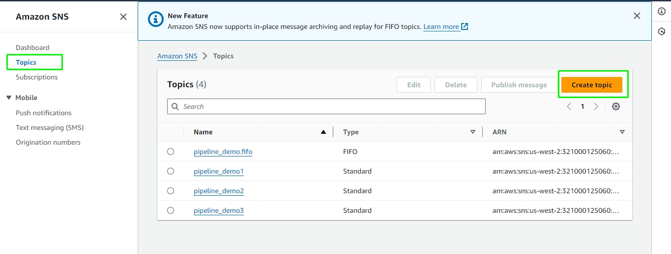 Once redirected to the SNS page, go to the "Topics" option and click on "Create topic".