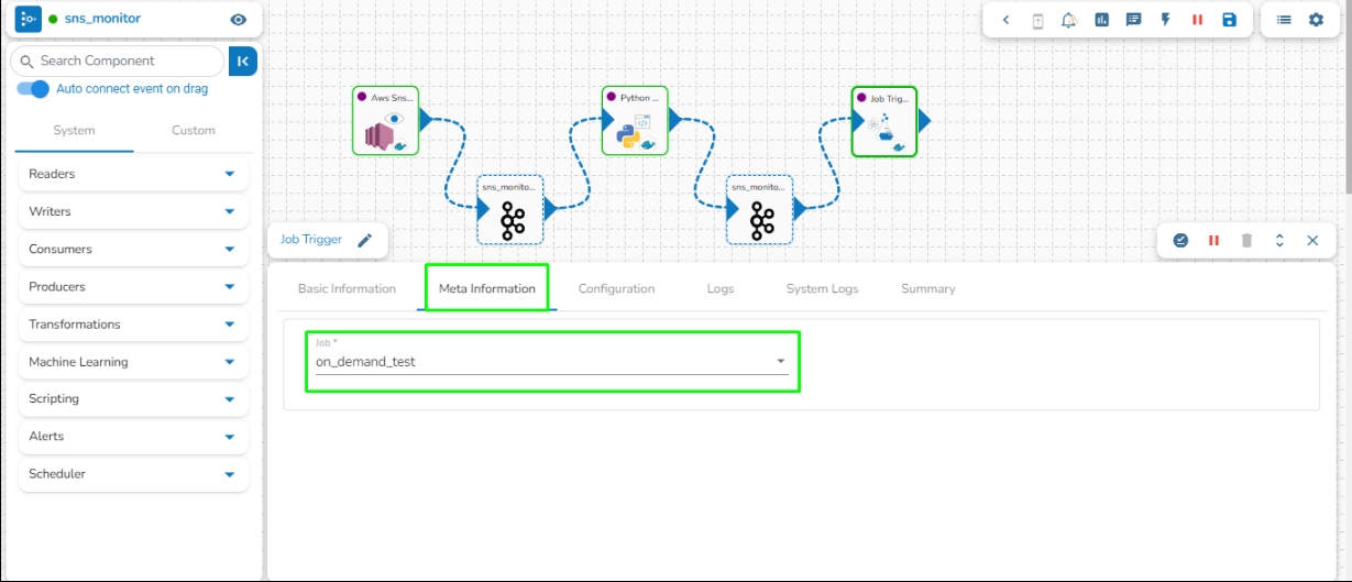 The Job Trigger component is designed to facilitate users in triggering the Python(On demand) Job through the pipeline. To configure this, users need to set up their Python (On demand) job name in the meta-information of the Job Trigger component within the pipeline. The in-event data of the Job Trigger component will then be utilized as a payload in the Python(On demand) Job.