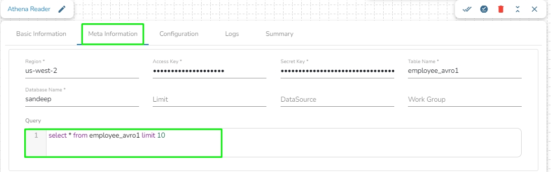 Workgroup: Enter the Workgroup name configured in Athena. The Workgroup in Athena is a resource type used to separate query execution and query history between Users, Teams, or Applications running under the same AWS account.