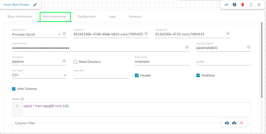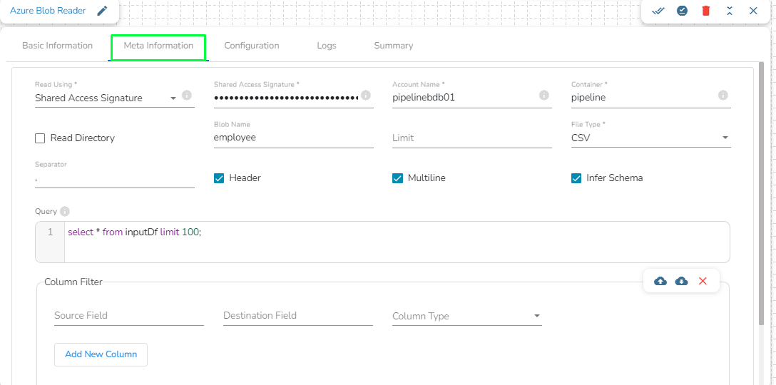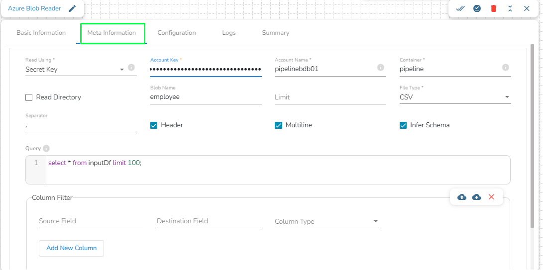 Column Filter: Enter the column names here. Only the specified columns will be fetched from Azure Blob. In this field, the user needs to fill in the following information:
