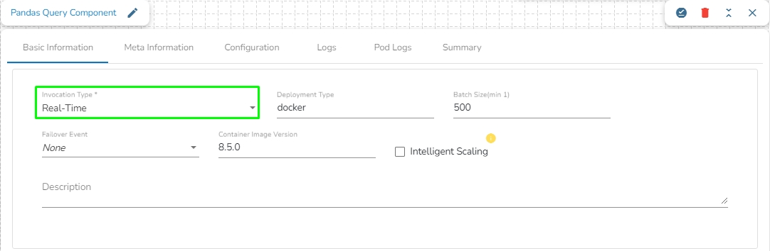 Select an Invocation type from the drop-down menu to confirm the running mode of the Pandas Query component. Select ‘Real-Time’ or ‘Batch’ from the drop-down menu.