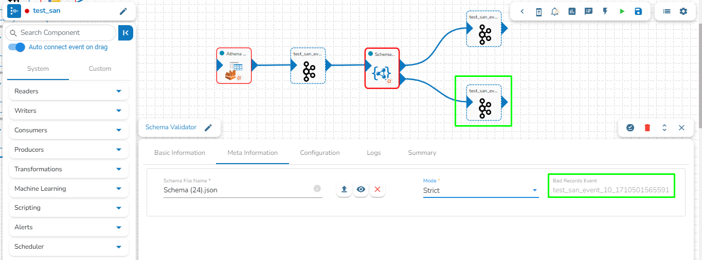 The Schema Validator component has two outputs. The first one is to pass the Schema Validated records successfully and the second one is to pass the Bad Record Event.