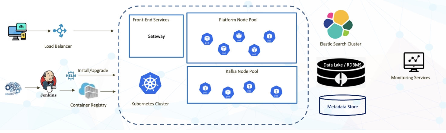 Each Microservice (Multiple services combined as container) is deployed as POD. Each POD is deployed into multiple Nodes for resilience.