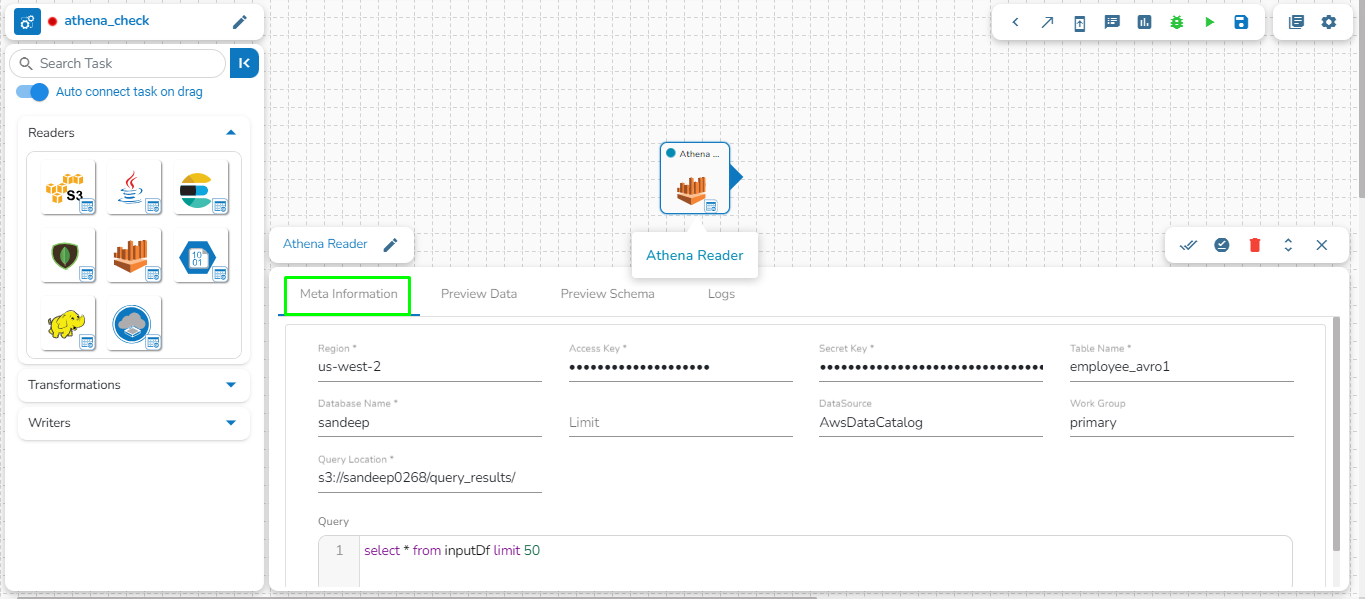 Drag and drop the new required task, make changes in the existing task’s meta information, or change the task configuration as the requirement. (E.g., the DB Reader is dragged to the workspace in the below-given image):