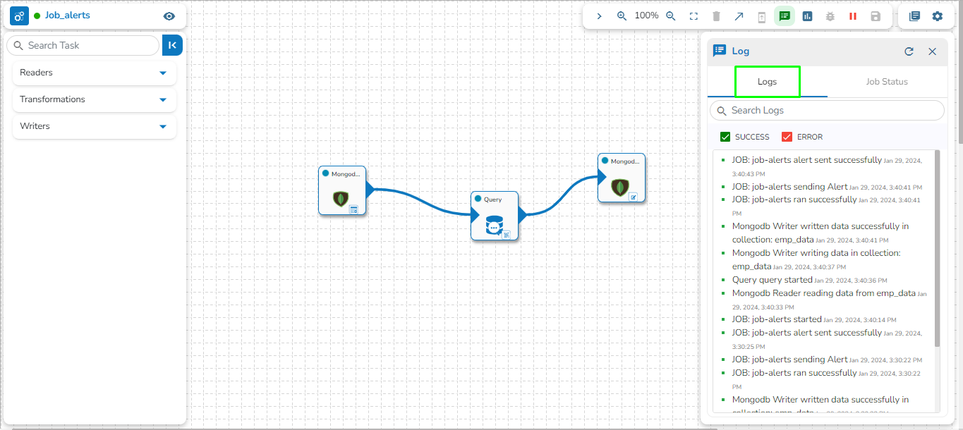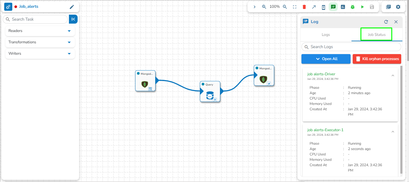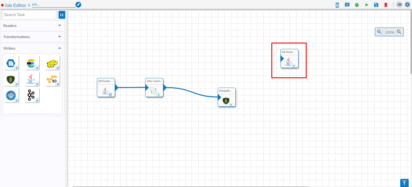 Please Note: If any orphan task is used in the Job Editor Workspace that is not in use, it will cause failure for the entire Job. So, avoid using any orphan task in the Job. Please see the image below, for reference. In the image below the highlighted DB writer task is an orphan task and if the Job is activated, then this Job will fail because the orphan DB writer task is not getting any input. Please avoid the use of an orphan task inside the Job Editor workspace.