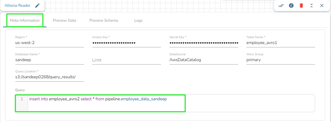 Athena Query Executer task enables users to read data directly from the external table created in AWS Athena.