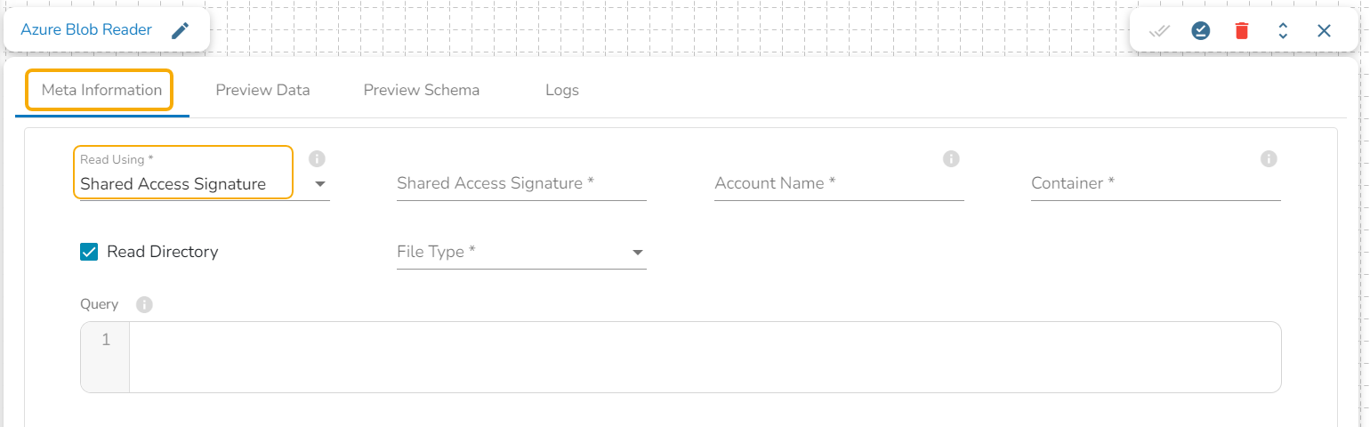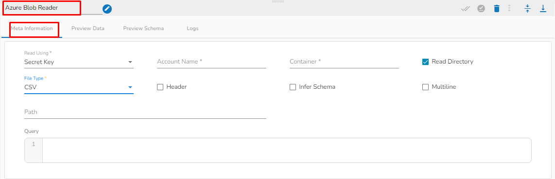 Drag the Azure Blob reader task to the Workspace and click on it to open the related configuration tabs for the same. The Meta Information tab opens by default.